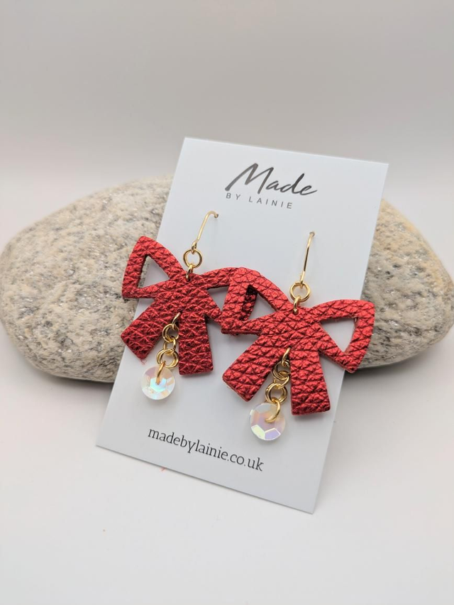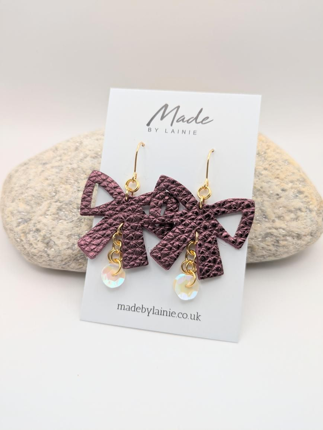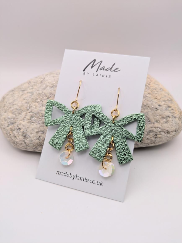 Featuring a charming bow shape cut from metallic leather, these earrings bring a playful yet elegant vibe to your party outfit. Two delicate pearlescent sequins dangle from each bow, catching the light with every move and adding a subtle sparkle.