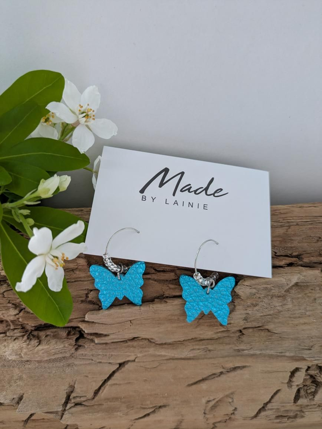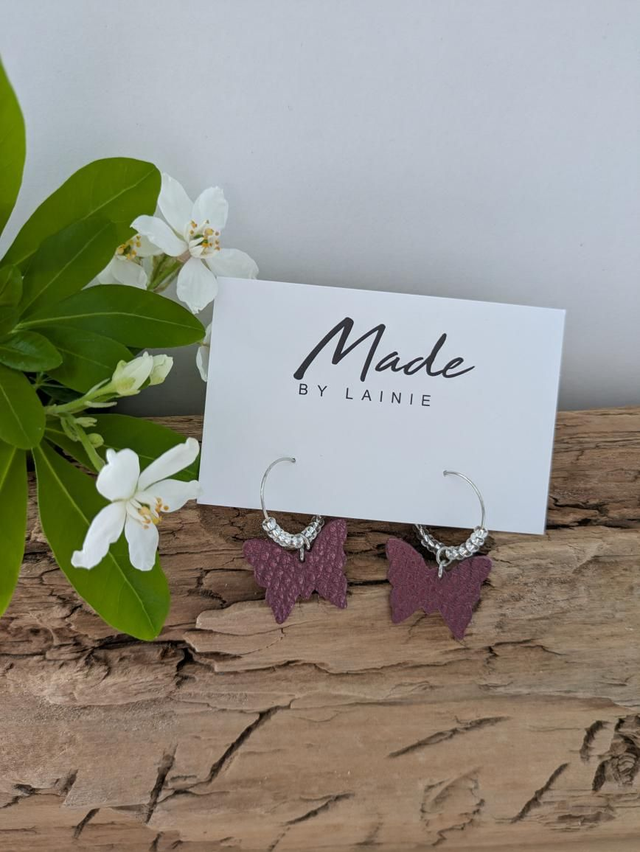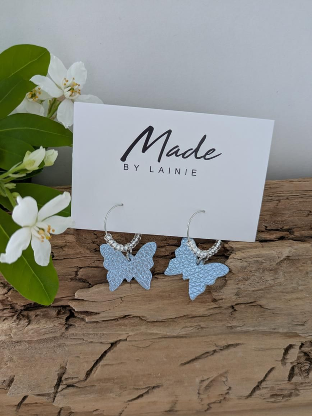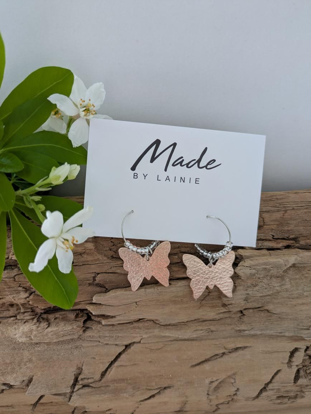 Delicate and eye-catching, these earrings feature metallic leather butterflies suspended from stainless steel hoops. The hoops are accented with shimmering silver-lined glass seed beads, adding a touch of sparkle.