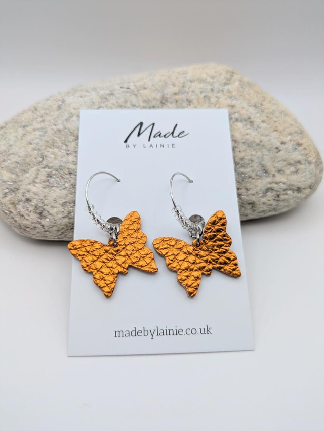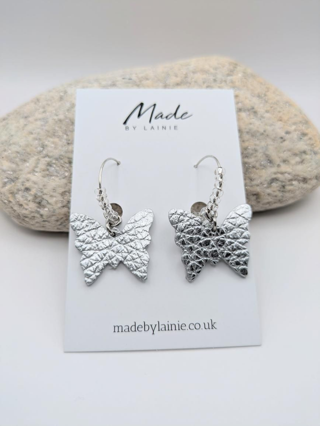 Delicate and eye-catching, these earrings feature metallic leather butterflies suspended from stainless steel hoops. The hoops are accented with shimmering silver-lined glass seed beads, adding a touch of sparkle.