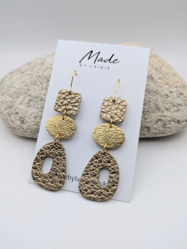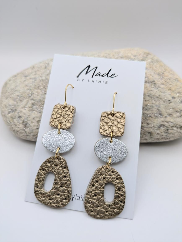 These striking earrings feature a richly textured champagne gold leather pebble shape with a cutout center and scattered perforations, creating a unique play of light and form. Suspended from a sleek oval accent in your choice of rose gold, silver, or gold leather, they are finished with a structured champagne leather square for a modern, balanced silhouette.