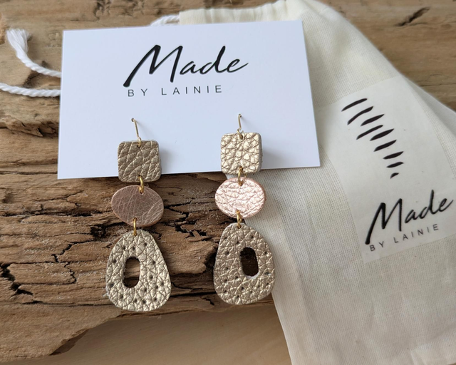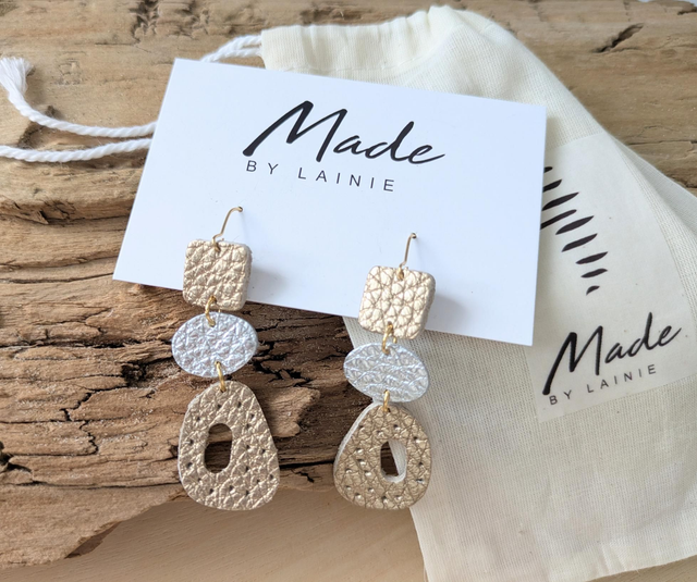 These striking earrings feature a richly textured champagne gold leather pebble shape with a cutout center and scattered perforations, creating a unique play of light and form. Suspended from a sleek oval accent in your choice of rose gold, silver, or gold leather, they are finished with a structured champagne leather square for a modern, balanced silhouette.