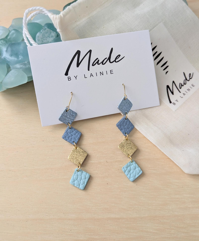 Meticulously handcrafted from small squares of shimmering metallic leather, suede and pebbled leather, these earrings catch the light with every turn. The clean geometric lines of this design will add a sophisticated edge to any outfit.