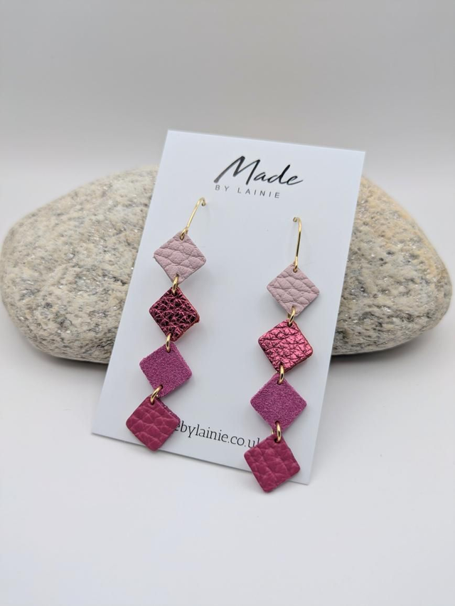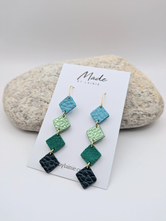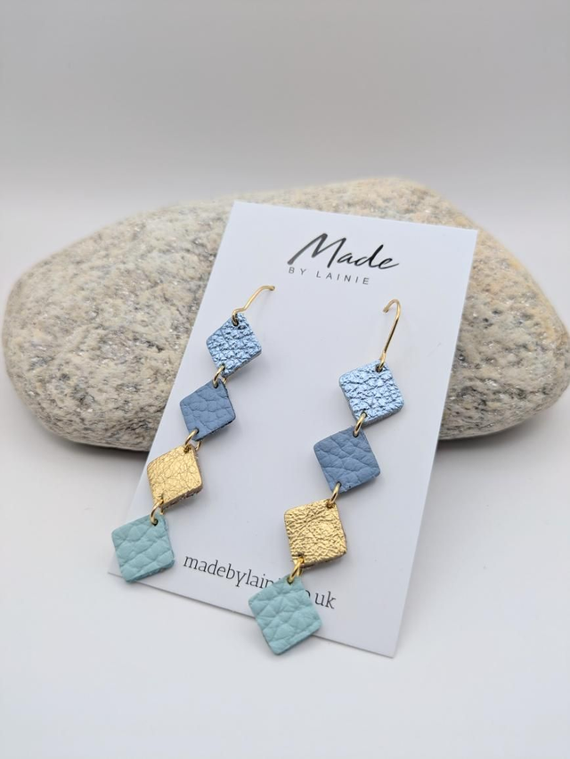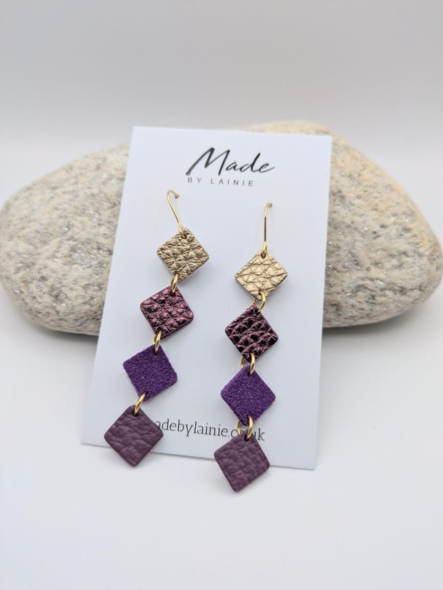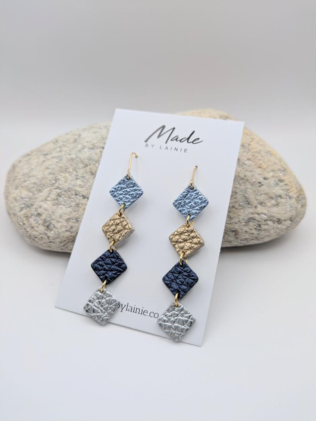 Meticulously handcrafted from small squares of shimmering metallic leather, suede and pebbled leather, these earrings catch the light with every turn. The clean geometric lines of this design will add a sophisticated edge to any outfit.