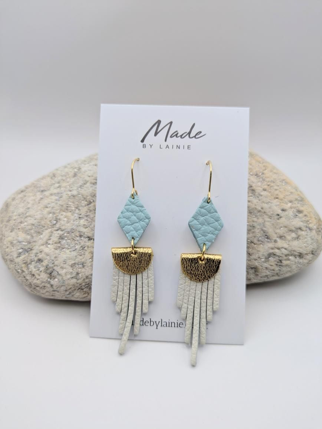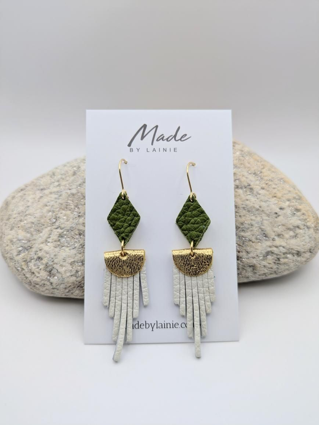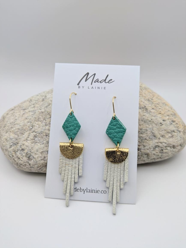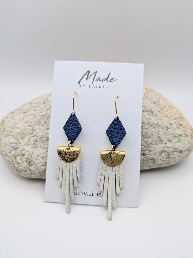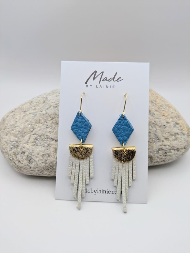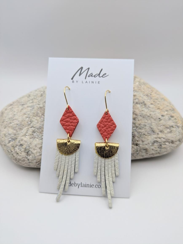 Inspired by North American Native artistry, the Elegant Spirit Drop Earrings are handcrafted from genuine leather. Featuring a colourful pebbled leather diamond, gold tone half-moon detail, and flowing ivory fringe, these lightweight statement earrings move beautifully with every step.
