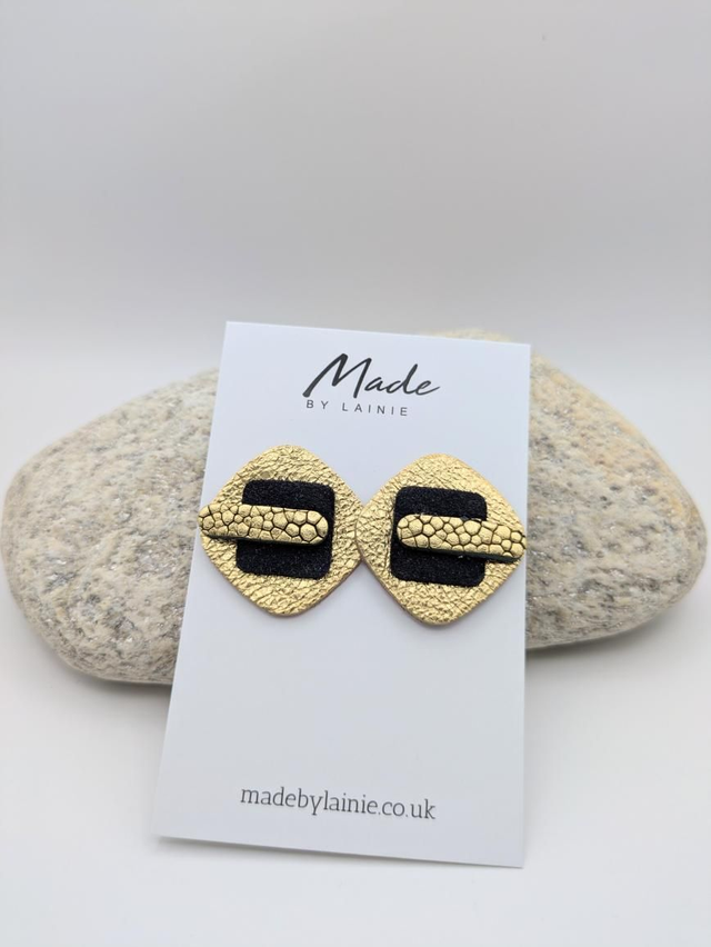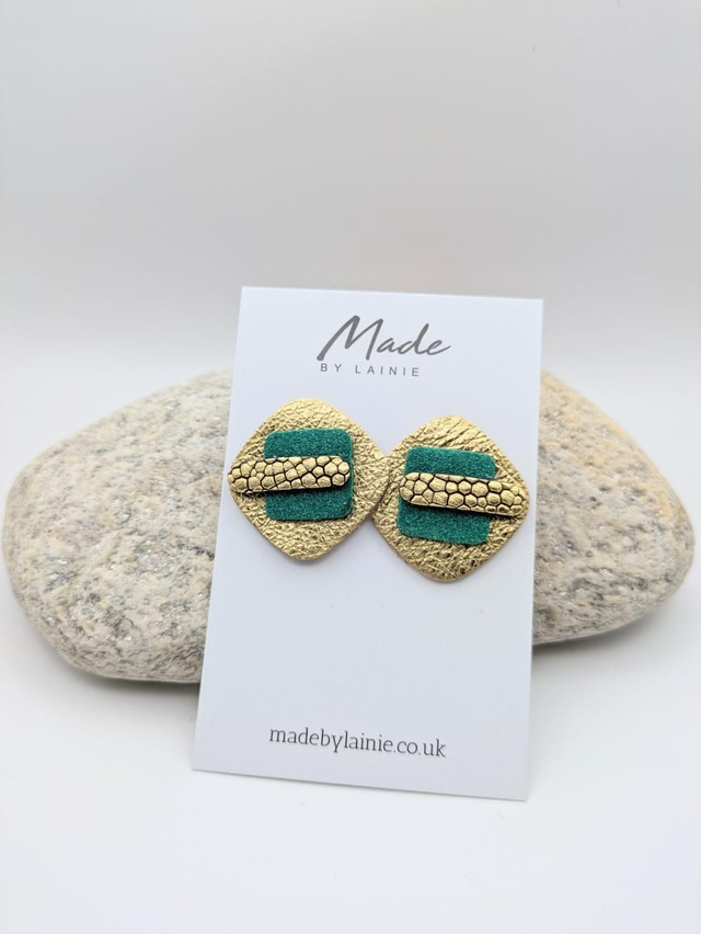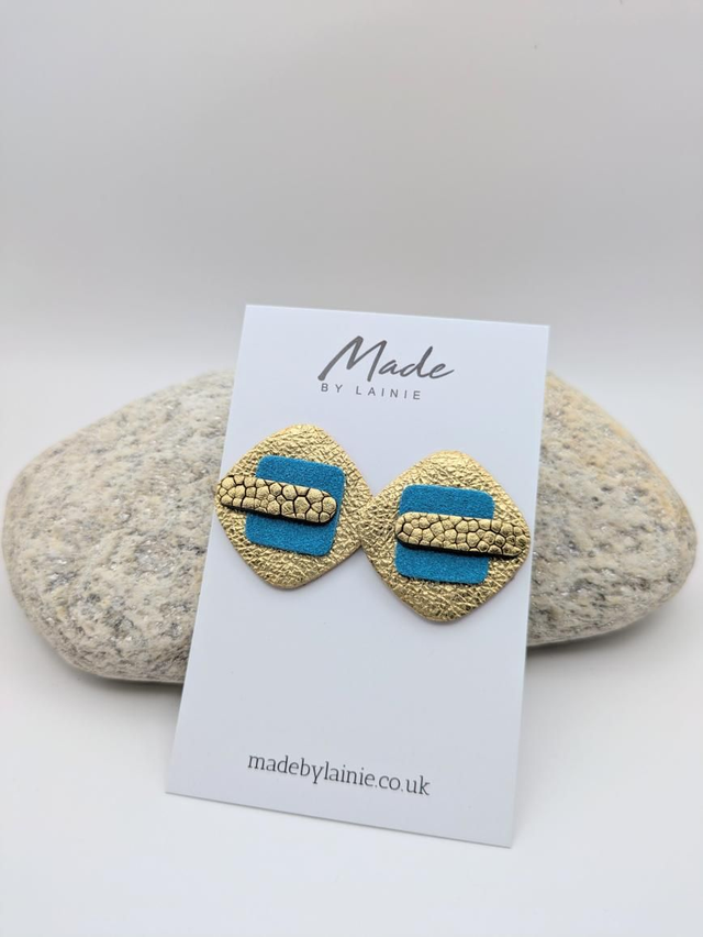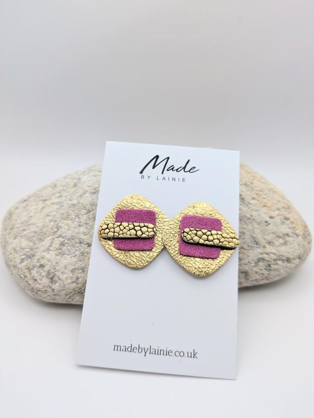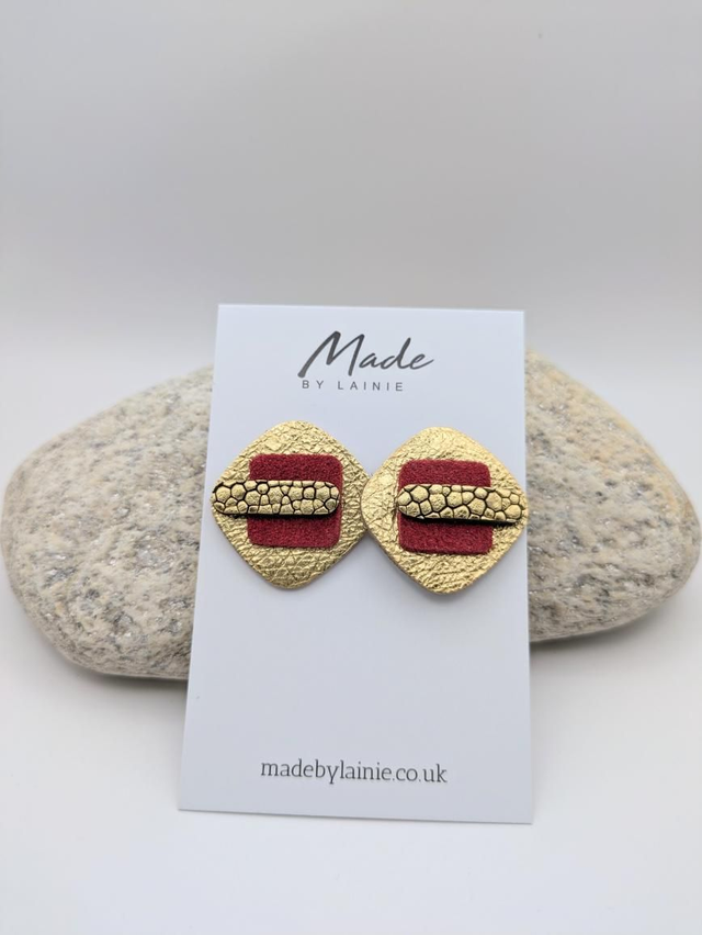 These gold leather stud earrings are layered with velvety suede and have a gently rounded square surface, giving them a tactile and visually intriguing element. The rich, suede lends an air of understated luxury and their silhouette provides a contemporary geometric edge. The stud design makes them versatile enough for everyday wear or dressed-up occasions.