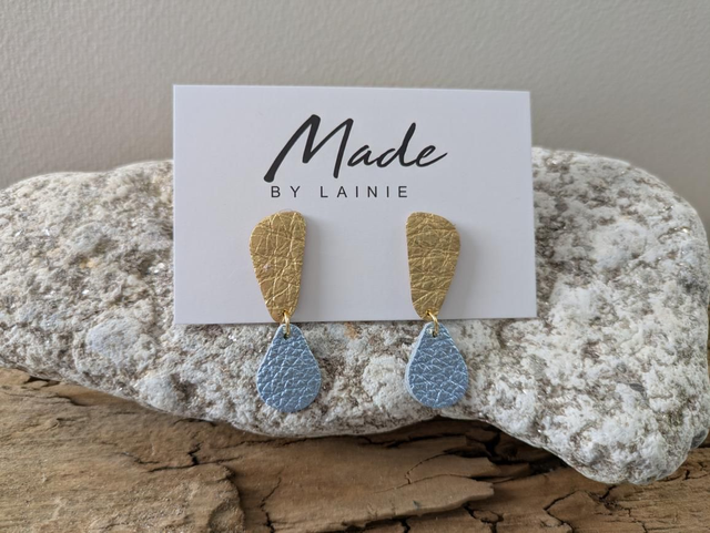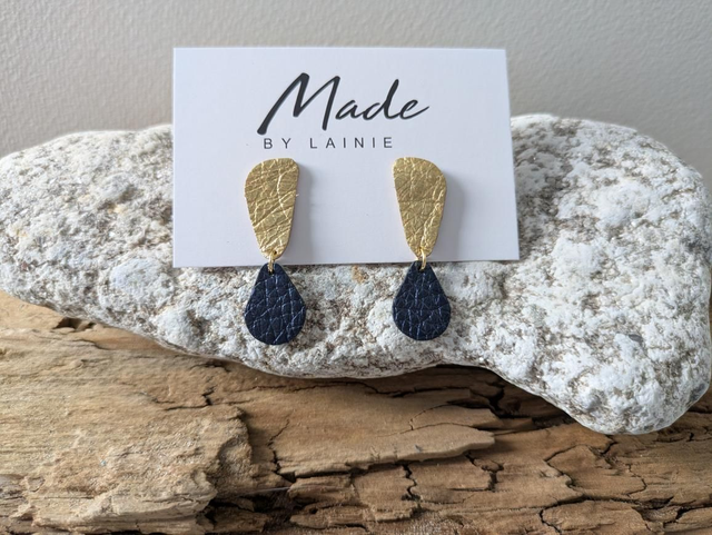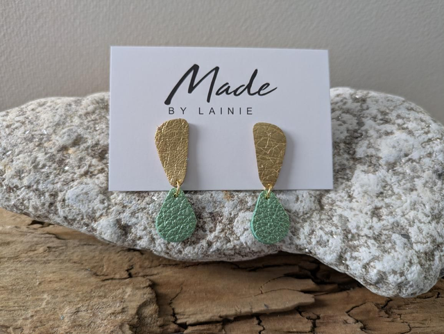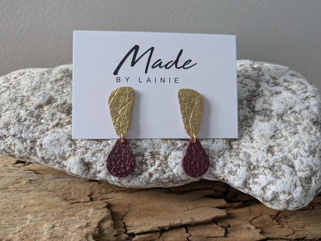 Made from high-quality leather, the irregular gold shape adds a modern, artistic flair, while the vibrant metallic teardrop catches the light with a jewell-like allure.