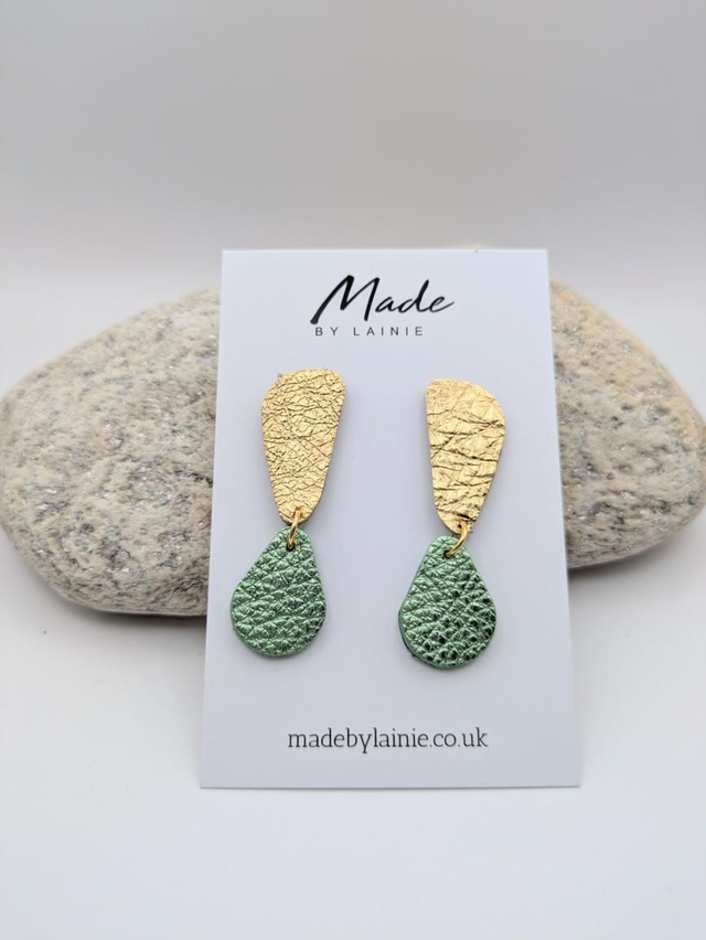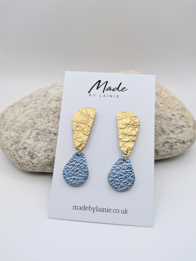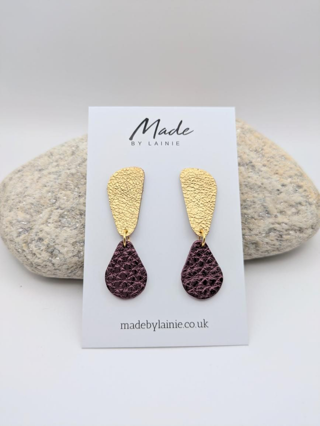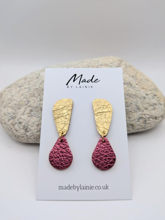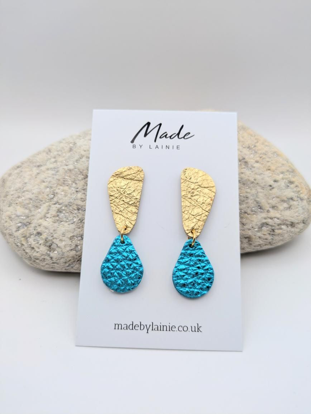Made from high-quality leather, the irregular gold shape adds a modern, artistic flair, while the vibrant metallic teardrop catches the light with a jewel-like allure.