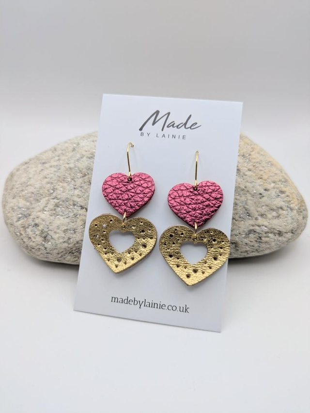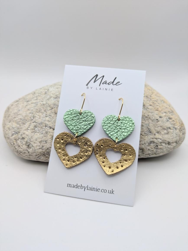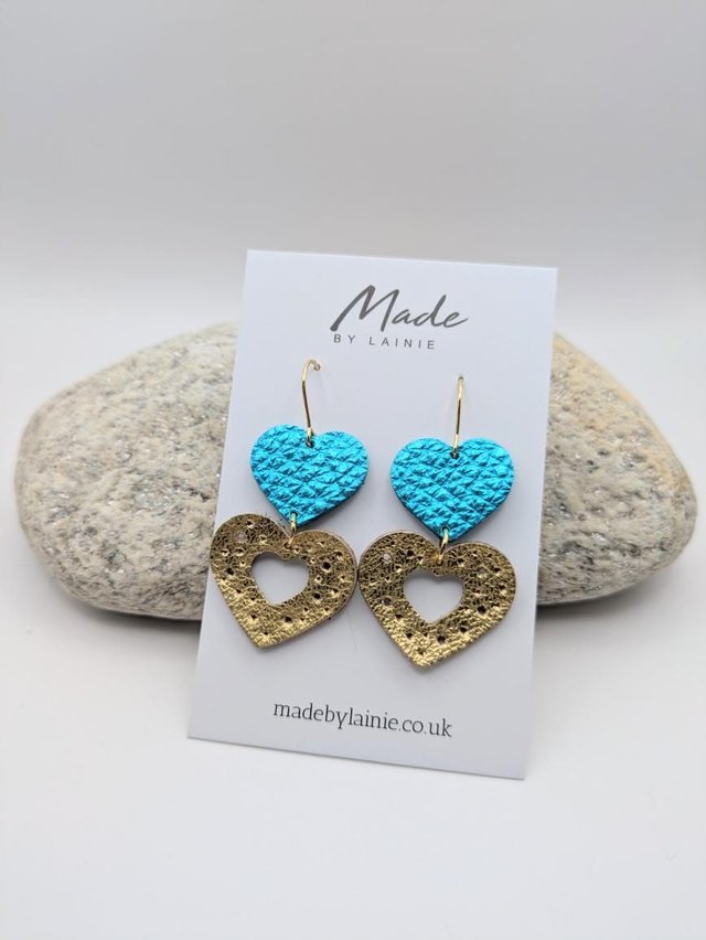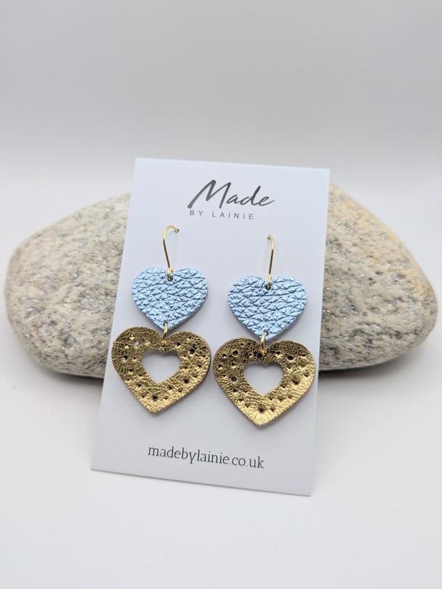 Crafted from beautiful metallic leather, these heart drop earrings are comfortable enough for all-day wear while still offering eye-catching texture and movement. The gold leather heart is delicately perforated with a heart cut-out, adding subtle detail and shine. Perfect for dressing up everyday outfits or adding a special touch to evening wear.