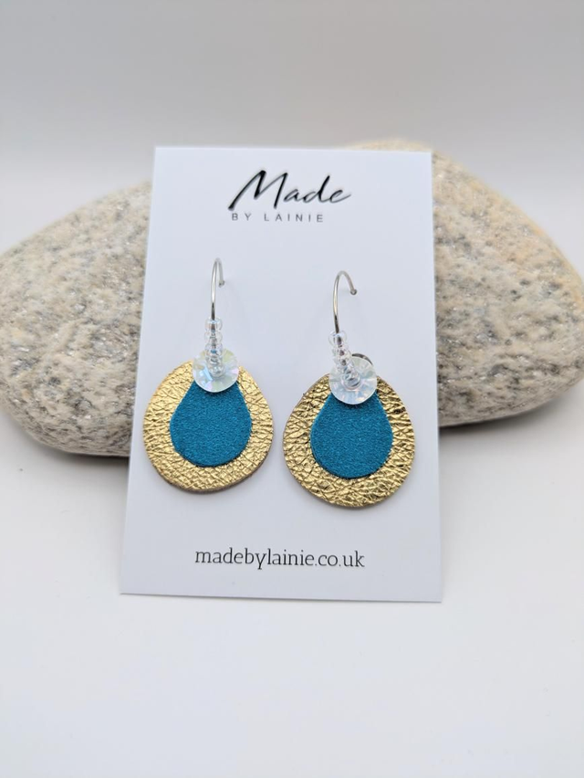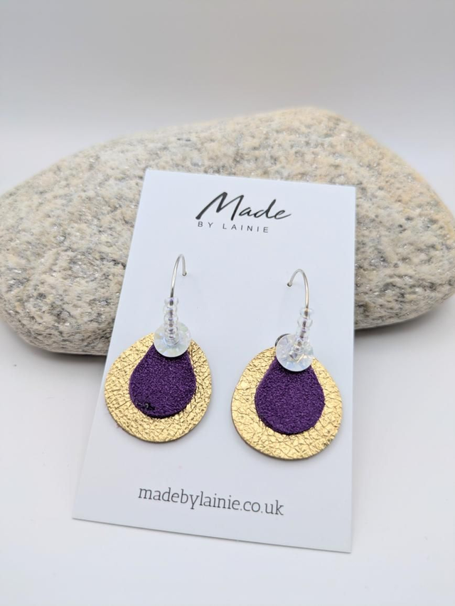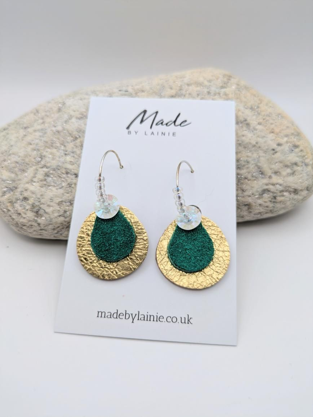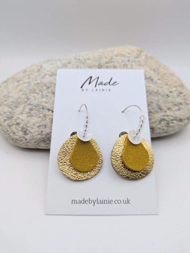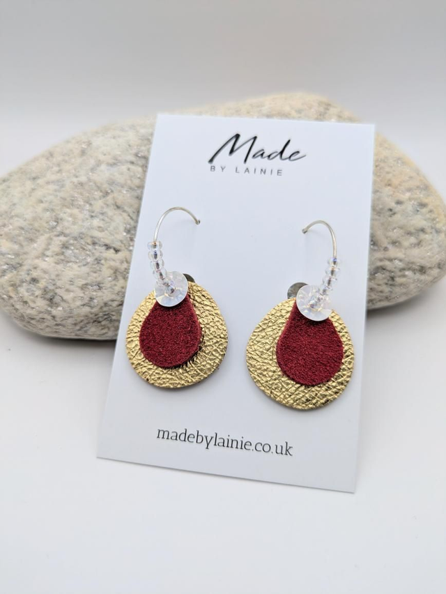 These statement earrings feature a petal inspired drop: a base of soft gold leather, topped with rich velvety suede, and finished with a pearlescent sequin that adds the perfect hint of shimmer. Each hoop is hand threaded with irridescent glass seed beads, catching and reflecting the light for a subtle glow. The combination of mixed textures and reflective details creates a look that's both artistic and effortlessly elegant.