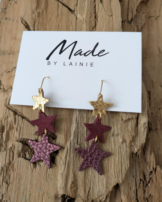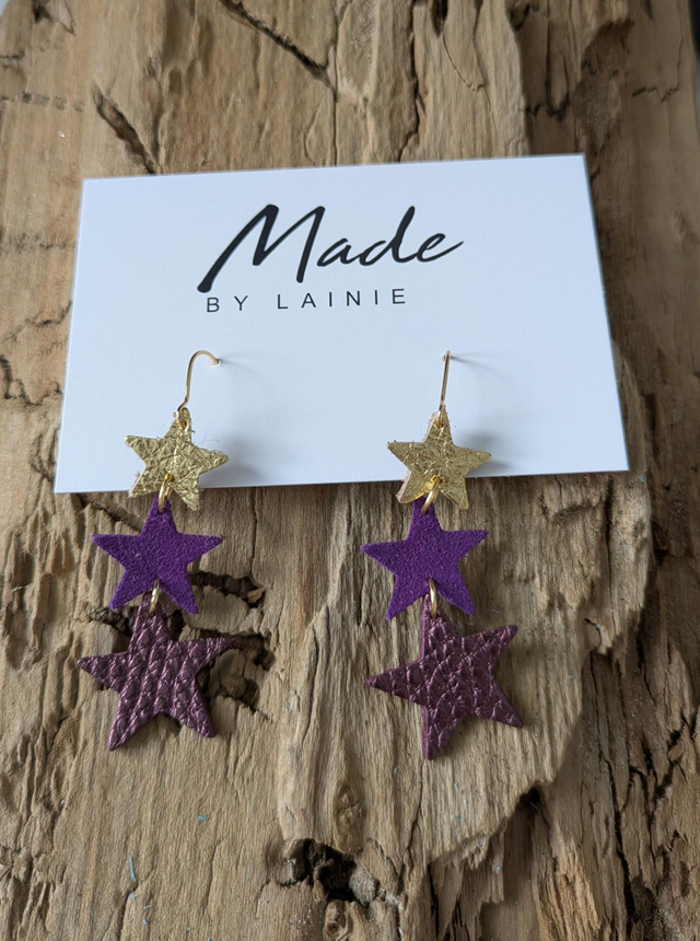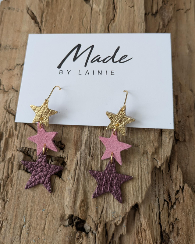 Add a bold sparkle to your outfit with these stunning handmade Star Drop Earrings. Crafted with care, each pair features a trio of stars - shimmering glold leather, soft suede and vibrant metallic leather - cascading in a playful, eye-catchng design.