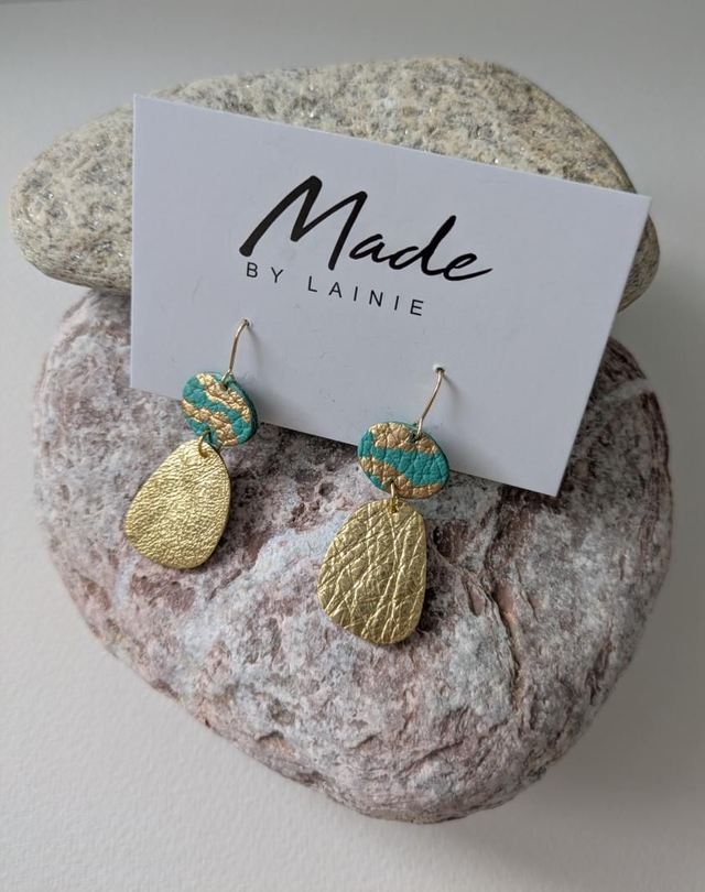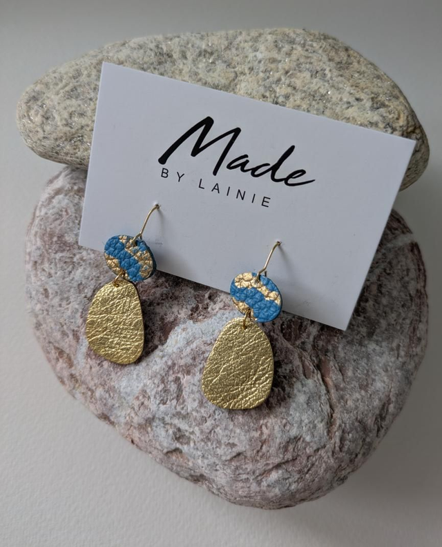 Inspired by the gentle curves of rounded pebbles and the rhythmic patterns etched into the sand by the tide, these earrings are thoughtfully crafted from leather to echo the organic elegance of nature. Their soft, pebble-like form catches the light with every movement, while a bold, colourful oval above adds a vibrant contrast. Each piece is hand-painted with liquid gilding, ensuring no two are exactly alike - making every pair a wearable work of art.